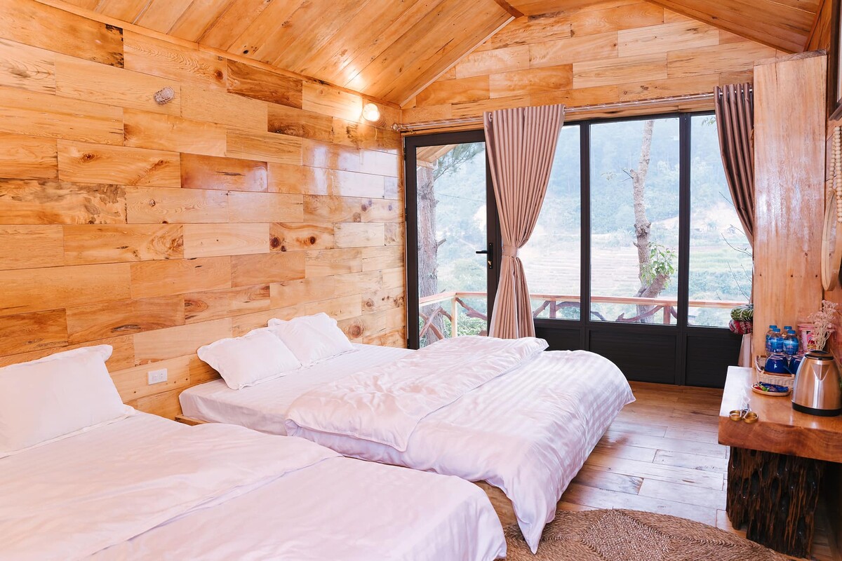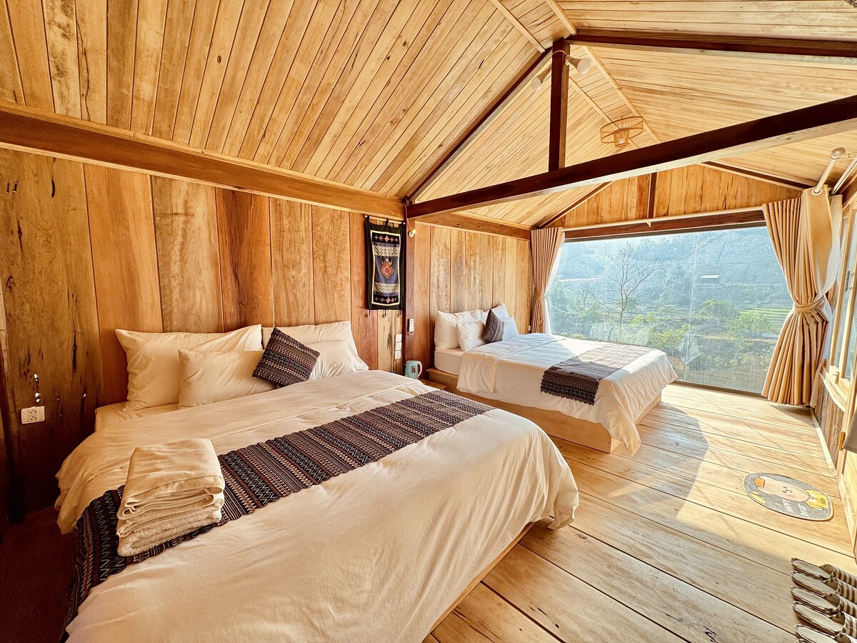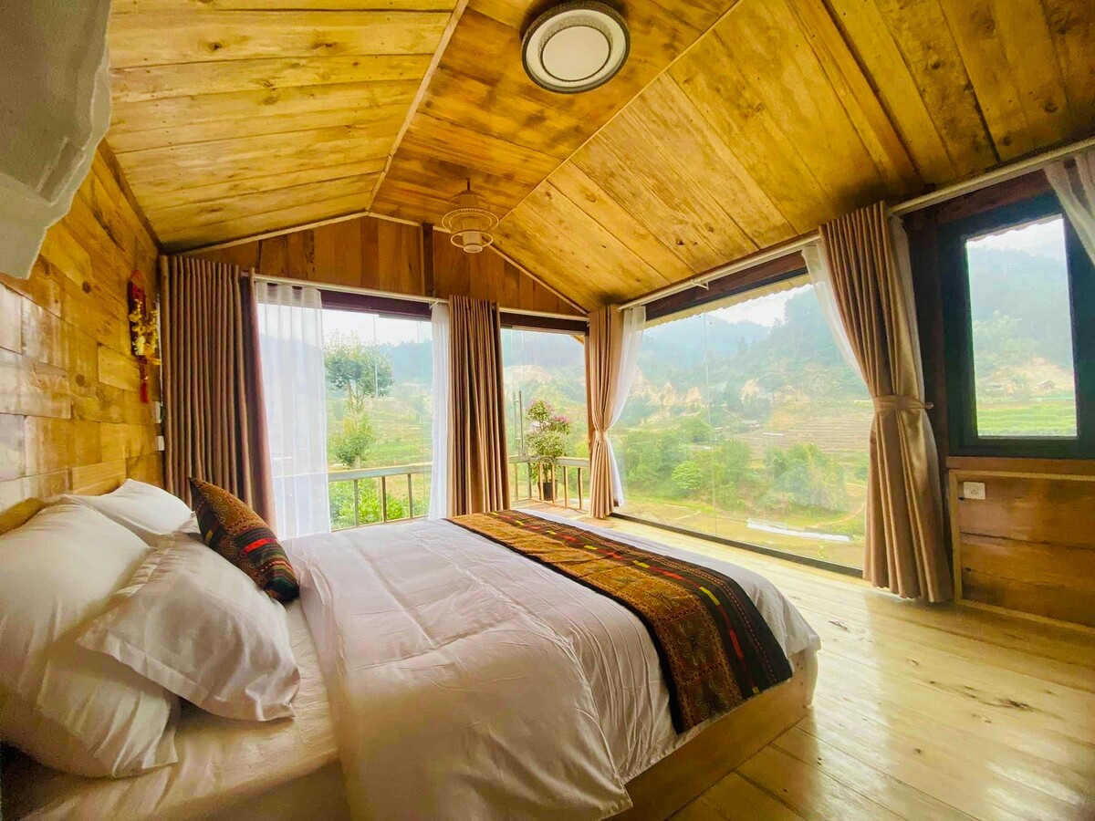 Bước qua cánh cửa, hương gỗ Pơ Mu thoang thoảng như lời chào đón những vị khách ghé thăm ngôi nhà nhỏ xinh. Bên trong vẻ ngoài thô mộc là cả một không gian ấm cúng, những hoạ tiết thổ cẩm, nhuộm chàm của người H'Mông được trang trí tinh tế, độc đáo cùng ban công view ôm trọn khung cảnh thiên nhiên hùng vĩ của Yên Bái